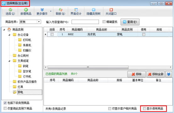 設(shè)置完成之后,新開一個(gè)單據(jù),添加商品明細(xì)進(jìn)行選擇商品時(shí),“選擇商品”窗口默認(rèn)不顯示已停用的商品,如圖2所示。