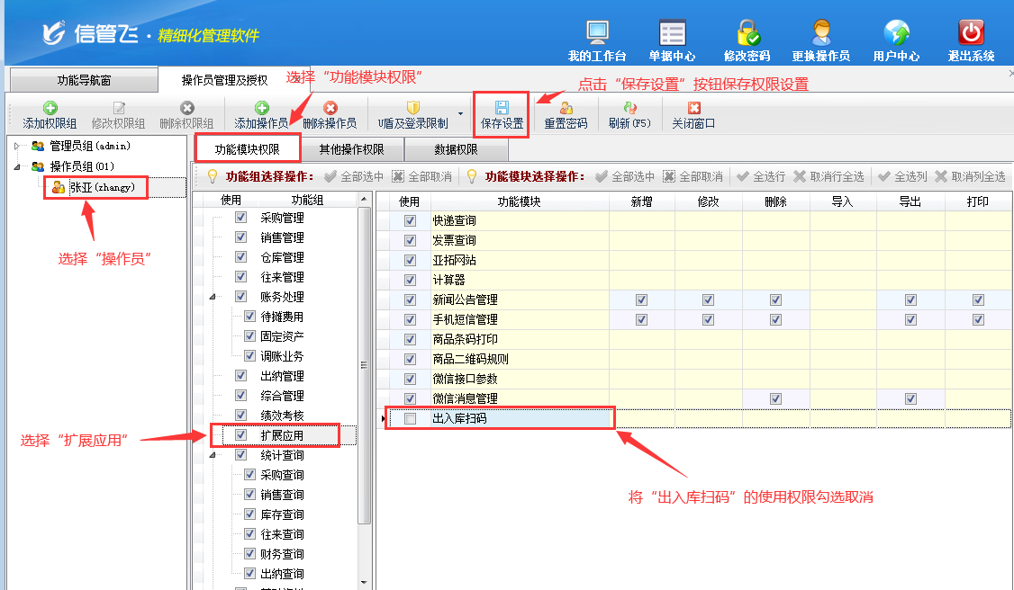 在功能導航窗點擊“系統管理”—》“操作員及授權”,進入“操作員管理及授權”界面,選擇操作員“張亞”,在其右側的功能模塊權限內選擇“擴展應用”模塊,將出入庫掃碼的“使用”權限勾選取消,然后保存設置,如下圖所示。