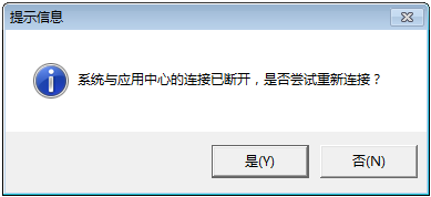 第一種解決方式:鼠標雙擊軟件界面最下方的“連接狀態:已斷開”字樣,系統會彈出“系統與應用中心的連接已斷開,是否嘗試重新連接?”提示信息,如圖2所示,點“是”按鈕,客戶端程序會嘗試重新建立與應用中心程序的連接。如果連接成功即可打開相應的功能,繼續使用軟件。