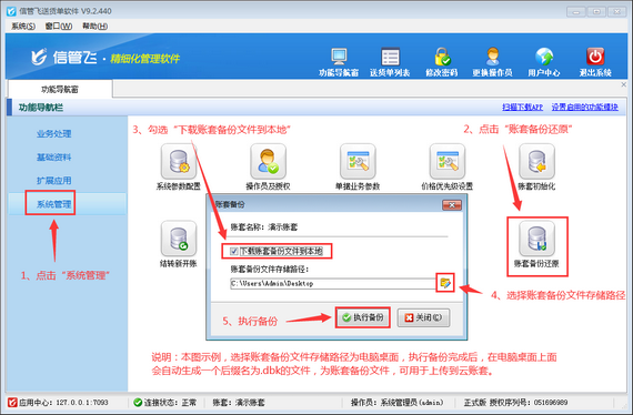 請用系統管理員賬號登錄信管飛送貨單軟件試用版,然后在功能導航窗中點擊“系統管理”—》“賬套備份還原”,在打開的“賬套備份”窗口勾選“下載賬套備份文件到本地”,選擇備份文件存儲路徑,然后“執行備份”即可,備份完成后在所選備份文件存儲的路徑,會自動生成一個后綴名為.dbk的文件,為賬套備份文件,可用于上傳到云賬套,如下圖所示。