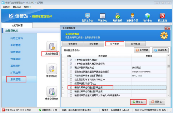 在功能導航窗選擇“系統(tǒng)管理”—》“系統(tǒng)參數(shù)配置”在業(yè)務參數(shù)的“業(yè)務單據(jù)相關參數(shù)”中勾選啟用參數(shù)“采購入庫單必須通過引單生成”,保存參數(shù)配置。如下圖所示: