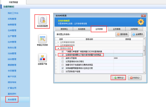 在功能導航窗點擊“系統管理”—》“系統參數配置”—》“業務參數”,即可打開業務參數設置界面,在查詢統計參數內勾選“倉庫庫存查詢默認不顯示庫存數量為0的商品”參數,然后點擊“保存”按鈕保存參數配置。如下圖所示: