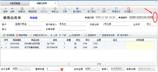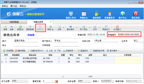 在功能導航窗點擊“銷售管理”—》“銷售出庫單”,開單并保存單據,單據會直接自動生成一個單據編號,如下圖1所示: