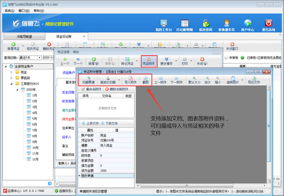 歡迎免費下載試用這款支持附件資料管理出納記賬軟件信管飛出納記賬軟件。