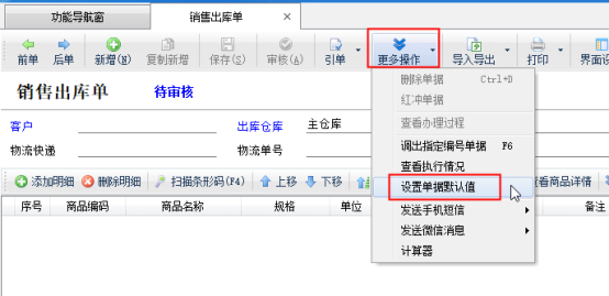 登錄軟件,在功能導(dǎo)航窗點(diǎn)“銷售管理”—》“銷售出庫單”,進(jìn)入新開銷售單界面,如圖2所示,點(diǎn)擊“更多操作”按鈕,點(diǎn)擊“設(shè)置單據(jù)默認(rèn)值”,系統(tǒng)彈出“設(shè)置單據(jù)默認(rèn)值”窗口,如圖3所示。