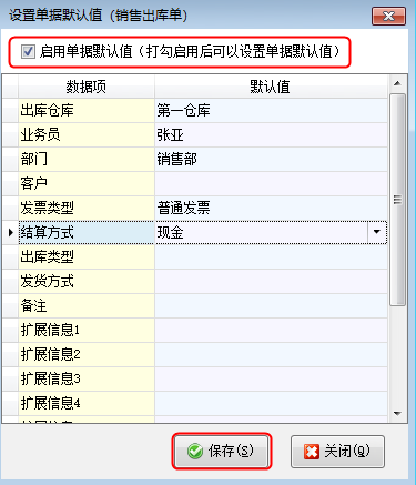 在“設(shè)置單據(jù)默認(rèn)值”窗口,勾選“啟用單據(jù)默認(rèn)值”,選擇需要設(shè)置的默認(rèn)值后點(diǎn)擊“保存”按鈕進(jìn)行保存。再次新增銷售出庫單時(shí),單據(jù)主體上面會(huì)直接顯示設(shè)置好的數(shù)據(jù)項(xiàng)默認(rèn)值,如圖4所示。