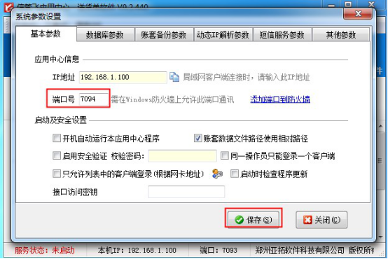打開應(yīng)用中心程序,點擊“系統(tǒng)參數(shù)”,在基本參數(shù)中修改下端口號,比如送貨單默認(rèn)端口號是7093,如果占用沖突,可修改為7094、7095...,修改后點擊保存,然后退出重啟應(yīng)用中心程序,如下圖所示: