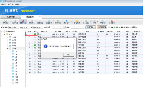 信管飛RMS標(biāo)準(zhǔn)版和專業(yè)版都包括登記出納日記賬憑證功能,在新增保存日記賬憑證后都可以直接審核憑證,憑證審核后,不允許直接刪除。客戶如果需要?jiǎng)h除已審核的憑證,需要先反審憑證,再進(jìn)行刪除。下面我們介紹一下在信管飛RMS專業(yè)版中如何刪除已審核的日記賬憑證?