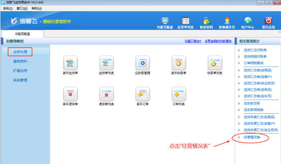 在功能導(dǎo)航窗點(diǎn)擊“業(yè)務(wù)處理”,業(yè)務(wù)處理模塊最右側(cè)是“相關(guān)查詢統(tǒng)計(jì)”,在相關(guān)查詢統(tǒng)計(jì)內(nèi)點(diǎn)擊“經(jīng)營(yíng)情況表”,如圖3所示。