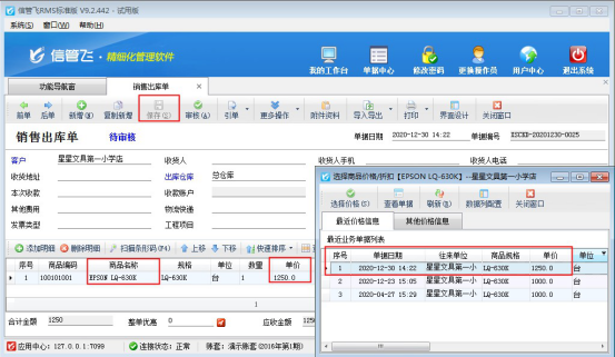 參數保存完成后,新開一個出庫單,選擇客戶“星星文具第一小學店”,選擇商品“EPSON LQ-630K”,價格修改為:1250元后保存單據,然后可以查看到最近價格信息中會顯示剛保存單據的價格信息,如下圖所示: