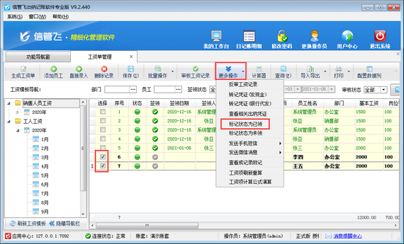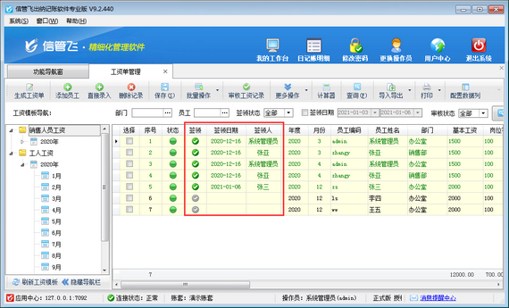 信管飛出納記賬軟件專(zhuān)業(yè)版包括工資管理功能,支持自定義工資模板,可根據(jù)設(shè)置的工資模板快速生成工資單,支持從上月工資單復(fù)制工資項(xiàng)目數(shù)據(jù),每月工資發(fā)放后,可將工資記錄標(biāo)記為簽領(lǐng)狀態(tài),如下圖所示,本文介紹一下出納記賬軟件中如何標(biāo)記工資記錄為已簽領(lǐng)狀態(tài)?