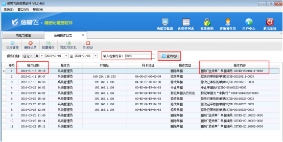 在系統操作日志界面,可以根據操作日期、檢索內容等條件進行查詢。以缺少的單號“0003”為例,輸入檢索內容“0003”后點擊“查詢”按鈕,可以看到單號0003被刪除的刪除記錄。如下圖3所示: