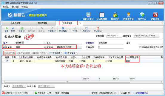 選擇示例客戶“亞拓軟件”,應收款為15980元,本次收款5000元,選擇應收款單據點擊“收款結算”,彈出的收款結算單界面,收款金額輸入5000,點擊“自動分配”分配到本次結銷金額中(如沒有默認資金賬戶,選擇收款賬戶輸入收款金額),然后保存并審核收款結算單,則表示此筆應收款結銷5000元,如下圖所示: