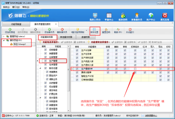 登錄軟件,在功能導航窗點擊“系統管理”—》“操作員及授權”,進入“操作員管理及授權”界面,選擇操作員“張亞”,在其右側的功能模塊權限內選擇“生產管理”模塊,將生產模板BOM的“反審修改”權限勾選取消,然后保存設置,如下圖所示。