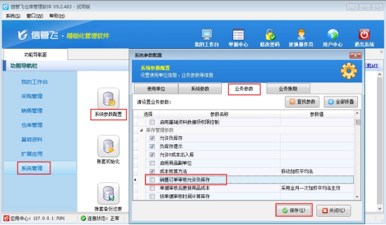 在功能導航窗點擊“系統管理”—》“系統參數配置”選擇“業務參數”,找到參數“銷售訂單審核允許負庫存”取消勾選,然后保存配置,如下圖所示:
