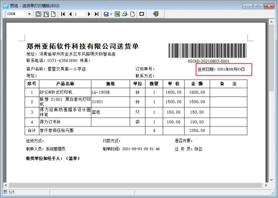 本文以“信管飛送貨單軟件”為例示范下如何修改,首先預(yù)覽下當(dāng)前打印效果上的日期顯示,如下圖所示: