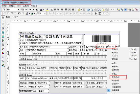 在打印格式設(shè)計(jì)界面,選擇打印格式模板點(diǎn)擊“設(shè)計(jì)格式”,進(jìn)入打印格式設(shè)計(jì)器界面,在模板設(shè)計(jì)器中點(diǎn)擊“送貨日期”文本框,鼠標(biāo)點(diǎn)擊右鍵,在彈出的界面上點(diǎn)擊“顯示格式”,進(jìn)入顯示格式設(shè)置界面,如下圖所示: