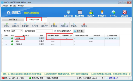 對資金賬戶“支付寶”進行結賬處理,選擇賬戶名稱為“支付寶”的記錄,點擊工具欄的“結賬”按鈕,系統會彈出提示“結賬賬期:2021-08-01~2021-08-31,結賬后該賬期內的憑證將不允許修改!”,點擊是,賬期會轉入下一賬期,如下圖所示: