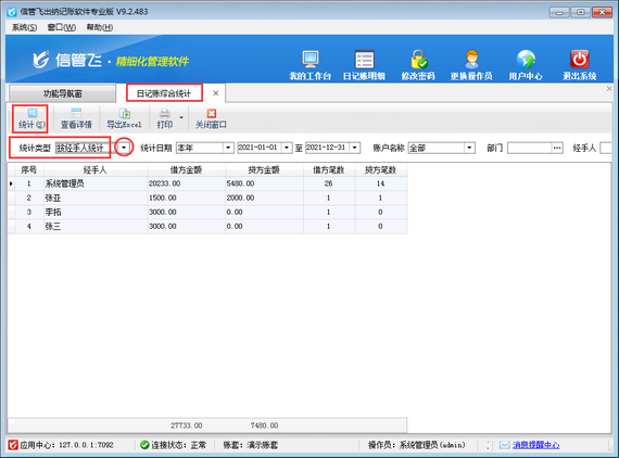 在“日記賬綜合統(tǒng)計(jì)”界面,統(tǒng)計(jì)類型選擇“按經(jīng)手人統(tǒng)計(jì)”,然后點(diǎn)擊“統(tǒng)計(jì)”按鈕,可以根據(jù)經(jīng)手人進(jìn)行統(tǒng)計(jì)。另外,系統(tǒng)支持根據(jù)日期、賬戶名稱、部門、經(jīng)手人等條件進(jìn)行統(tǒng)計(jì)查詢。