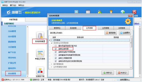 首先需要啟用下倉庫權限,在功能導航窗點擊“系統管理”—》“系統參數配置”,在“業務參數”中勾選啟用參數“啟用倉庫權限”,保存配置,如下圖所示: