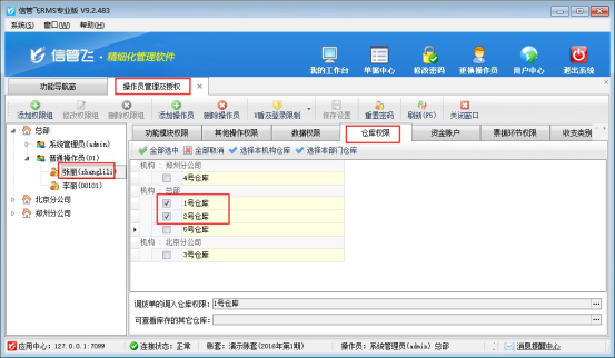 啟用參數后,下一步可設置操作員可查看的倉庫權限,在功能導航窗點擊“系統管理”—》“操作員及授權”進入操作員及授權界面,選擇操作員“張麗”,設置倉庫權限,可查看倉庫“1號倉庫和2號倉庫”。然后保存配置,如下圖所示:
