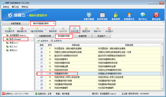 在功能導(dǎo)航窗點(diǎn)擊“系統(tǒng)管理”—》“操作員及授權(quán)”打開(kāi)操作員管理及授權(quán)界面,選擇操作員“張亞”,在“其他操作權(quán)限”中把權(quán)限“可查看附件資料”勾選取消,然后點(diǎn)擊“保存設(shè)置”按鈕保存權(quán)限設(shè)置,如下圖所示: