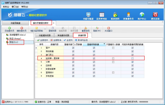 在功能導航窗點擊“系統管理”—》“操作員及授權”,進入操作員及授權界面,選擇操作員“李拓”,在“數據權限”中,把“送貨單、退貨單”權限對應的“可修改有查看權限的數據”選擇取消勾選,保存權限設置。如下圖所示: