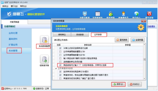 在功能導航窗點擊“系統(tǒng)管理”—》“系統(tǒng)參數配置”,勾選啟用“業(yè)務參數”中的“商品規(guī)格可以輸入”|“分成多種規(guī)格,開單可以選擇”參數。如下圖所示: