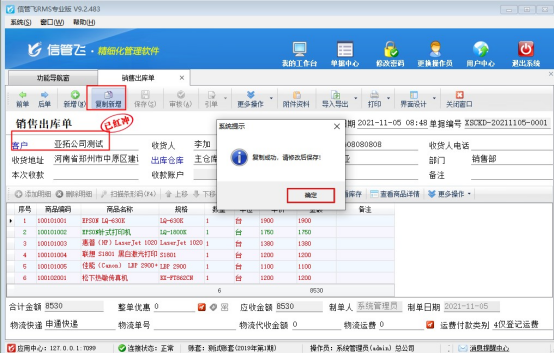 紅沖單據后,點擊工具欄的“復制新增”按鈕,會復制此單全部內容,系統彈出提示框“復制成功,請修改后保存!”,點擊“確定”按鈕,如下圖所示: