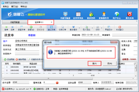 送貨單界面,修改單據(jù)日期為2021年11月9日,錄入單據(jù)主體和單據(jù)明細(xì)信息,點(diǎn)擊保存按鈕后,會(huì)彈出提示“當(dāng)前輸入的單據(jù)日期【2021-11-09】大于當(dāng)前系統(tǒng)日期【2021-11-08】,確定繼續(xù)保存嗎?”。如下圖所示:
