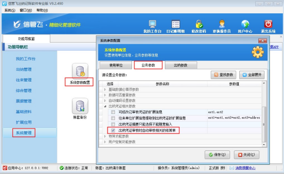 在“功能導航窗”點擊“系統管理”—》“系統參數配置”,啟用“業務參數”中的“出納憑證審核時自動審核相關的結算單”參數,如下圖所示: