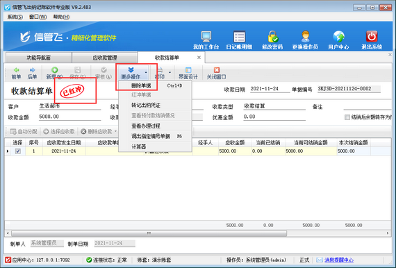 然后在收款結算單界面點擊“更多操作”—》“紅沖單據”,如下圖所示,單據紅沖后,點擊“更多操作”—》“刪除按鈕”,即可刪除收款結算單。