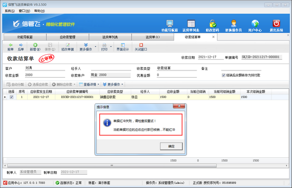 應(yīng)收、應(yīng)付賬款管理是現(xiàn)代企業(yè)資金管理的重要組成部分,其管理效果的好壞直接影響到企業(yè)經(jīng)營的成敗,信管飛RMS、信管飛出納記賬軟件及信管飛送貨單軟件均支持管理往來賬款,如果應(yīng)收款結(jié)銷后發(fā)現(xiàn)收款結(jié)銷錯(cuò)誤,系統(tǒng)支持紅沖并刪除收款記錄,部分用戶在紅沖收款結(jié)算單時(shí)會出現(xiàn)如下圖提示:收款結(jié)算單紅沖失敗,當(dāng)前單據(jù)對應(yīng)的應(yīng)收應(yīng)付款已結(jié)銷,不能紅沖!