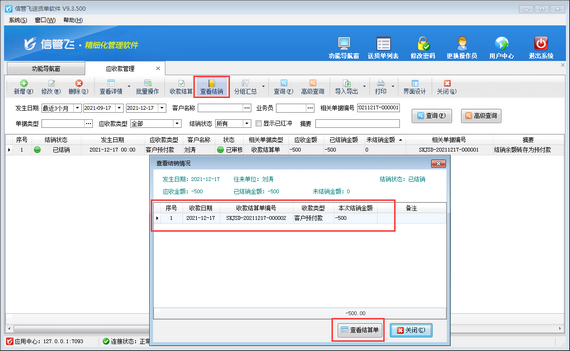 然后,選中此已結(jié)銷的客戶預(yù)付款記錄,在工具欄點(diǎn)擊“查看結(jié)銷”—》“查看結(jié)算單”,打開此客戶預(yù)付款的結(jié)銷記錄,將此客戶預(yù)付款結(jié)銷記錄先紅沖刪除后,單據(jù)編號為“SKJSD-20211217-000001”的收款結(jié)算單即可紅沖刪除成功,如下圖所示。