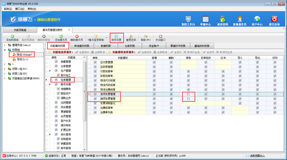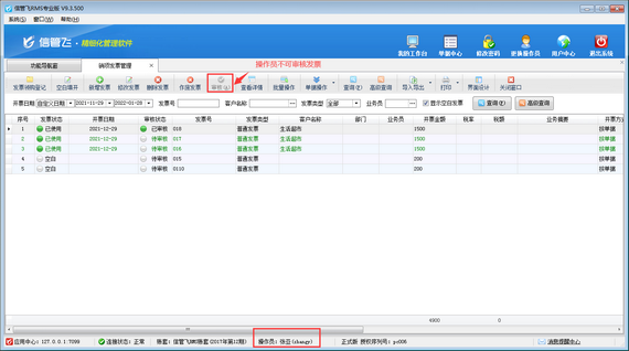 信管飛RMS最新版本V9.3.500增加參數“發票審核后更新相關單據的開票狀態”,同時也支持設置操作員發票審核權限,本篇文章介紹一下進銷存管理軟件中如何設置操作員不可審核發票。