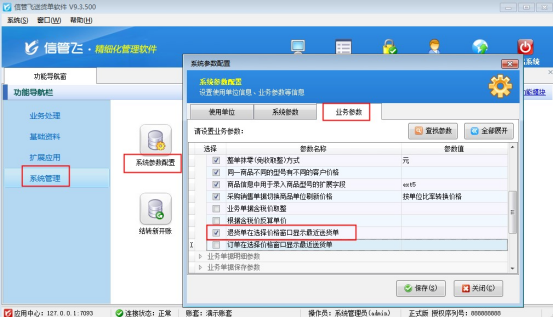 在功能導(dǎo)航窗點(diǎn)擊“系統(tǒng)管理”—》“系統(tǒng)參數(shù)配置”,把“業(yè)務(wù)參數(shù)”中的“退貨單在選擇價(jià)格窗口顯示最近送貨單”參數(shù)啟用保存,如下圖所示: