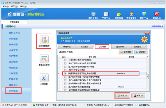 在功能導航窗點擊“系統(tǒng)管理”—》“系統(tǒng)參數(shù)配置”—》“業(yè)務(wù)參數(shù)”打開業(yè)務(wù)參數(shù)配置界面,然后在生產(chǎn)管理相關(guān)參數(shù)中打鉤啟用“銷售訂單顯示已下達生產(chǎn)任務(wù)數(shù)量”參數(shù),并設(shè)置參數(shù)值,默認為“extnum20(擴展數(shù)值20)”,如下圖所示。