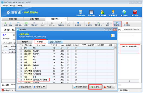 參數(shù)配置完成之后,打開銷售訂單,在“界面設(shè)計”—》“單據(jù)明細”中將“擴展數(shù)值20”自定義列名為“已下達生產(chǎn)任務(wù)數(shù)量”,并勾選顯示出來,如下圖所示。