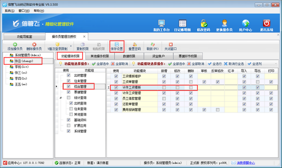 在功能導(dǎo)航窗點(diǎn)擊“系統(tǒng)管理”—》“操作員及授權(quán)”,打開操作員管理及授權(quán)界面,選擇操作員“張亞”,在其右側(cè)的功能模塊權(quán)限內(nèi)選擇“綜合管理”模塊,將“計(jì)件工資模板”的“新增、修改、刪除”權(quán)限勾選取消,然后保存設(shè)置,如下圖所示。