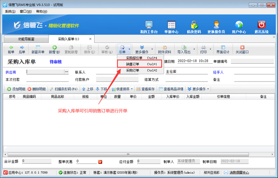 信管飛RMS(進銷存管理軟件)支持根據銷售訂單進行采購入庫進貨(如下圖所示),同時也支持配置操作員采購入庫單引用銷售訂單開單權限,本篇文章介紹一下進銷存管理軟件內如何設置操作員開采購入庫單不可引用銷售訂單?