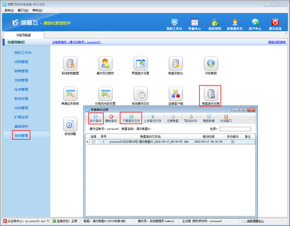 登錄已有賬套,然后在功能導(dǎo)航窗中點(diǎn)擊“系統(tǒng)管理”—》“賬套備份還原”,在打開(kāi)的“賬套備份還原”窗口,執(zhí)行備份并將備份文件下載到本地存儲(chǔ),如下圖所示。