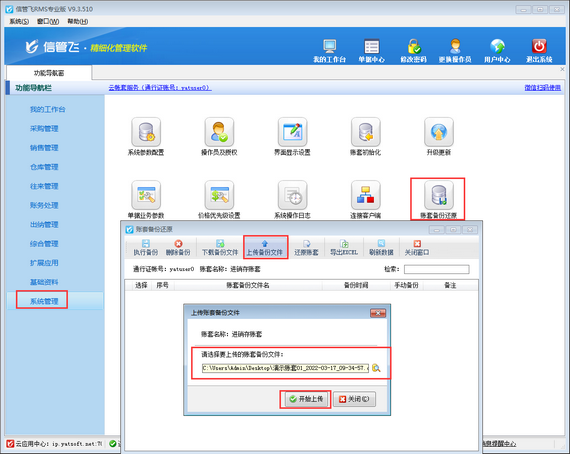 新建的賬套登錄后,同樣在功能導(dǎo)航窗中點(diǎn)擊“系統(tǒng)管理”—》“賬套備份還原”,在打開(kāi)的“賬套備份還原”窗口,上傳備份文件并還原賬套,如下圖所示。