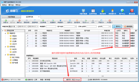 歡迎下載試用這款支持設置操作員只能查看本人送貨單、退貨單的送貨單打印軟件:信管飛送貨單軟件。