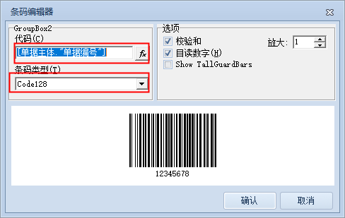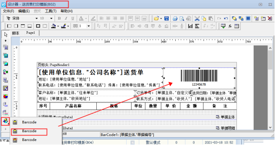 需要單據編號以條形碼形式顯示,在打印模板設計器界面先刪除原文本框。點擊左側工具欄最下邊圖標,下拉列表點擊“Barcode”添加放置到原單據編號位置,放置完成雙擊打開進行配置調用參數和條碼類型,如下圖所示: