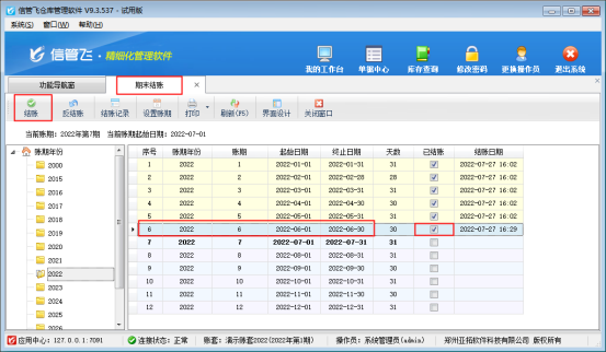 在功能導航窗點擊“基礎資料”—》“期末結賬”,進入期末結賬界面,本文示例鎖定2022年6月份的單據,在期末結賬界面,選擇賬期年份2022年6月,工具欄點擊“結賬”按鈕進行操作結賬,結賬完成后,已結賬處顯示已勾選,賬期進入2022年7月份,如下圖所示: