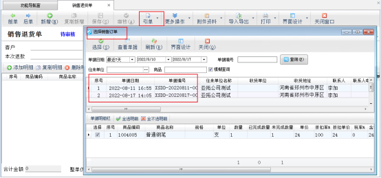 在功能導(dǎo)航窗點(diǎn)擊“銷(xiāo)售管理”—》“銷(xiāo)售退貨單”,進(jìn)入銷(xiāo)售退貨單界面,在銷(xiāo)售退貨單界面工具欄內(nèi)點(diǎn)擊“引單”—》“銷(xiāo)售訂單”可打開(kāi)“選擇銷(xiāo)售訂單”窗口,在此窗口選擇相應(yīng)的銷(xiāo)售訂單,然后保存并審核,如下圖所示: