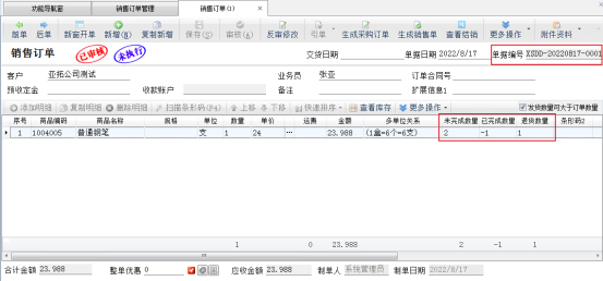 銷(xiāo)售退貨單引單訂單審核完成后,進(jìn)入銷(xiāo)售訂單管理界面,打開(kāi)引單過(guò)的銷(xiāo)售訂單,可以看到訂單的完成數(shù)量以及退貨數(shù)量已更新。