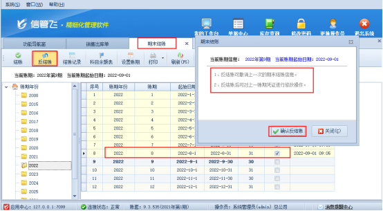 出現此提示,是因為軟件已把8月份賬已結賬導致,結賬后賬期內單據無法修改和新增,需要補錄8月份的單據,需要先進行“反結賬”操作,在功能導航窗點擊“財務處理”—“期末結賬”。在期末結賬界面可看到當前結賬日期到2022-8-31,點擊工具欄“反結賬”按鈕,彈出提示消息,點擊“確認反結賬”,賬期往后倒一個月,結賬時間到2022-7-31,如下圖所示: