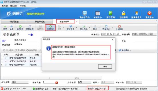 “一審”操作員“張亞”登錄軟件,新開銷售出庫單,保存并審核單據(jù),審核狀態(tài)顯示“一審”,操作員“張亞”沒有二審權(quán)限,再次點(diǎn)擊“審核”會(huì)提示“系統(tǒng)已啟用多環(huán)節(jié)審核權(quán)限控制,您沒有當(dāng)前環(huán)節(jié)的審核權(quán)限!”如下圖所示: