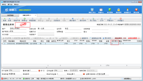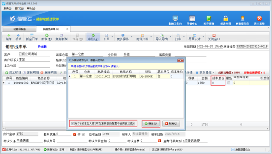 設(shè)置完成后,在功能導(dǎo)航窗點(diǎn)擊“銷售管理”—》“銷售出庫(kù)單”,新開銷售出庫(kù)單,此時(shí)如果商品的成本單價(jià)為0,審核單據(jù)時(shí)會(huì)出現(xiàn)“以下商品成本價(jià)為0,請(qǐng)輸入成本價(jià)”的提示信息,這時(shí)需要勾選左下方允許0成本出入庫(kù),之后點(diǎn)擊“確定”,單據(jù)可審核成功,如下圖所示:
